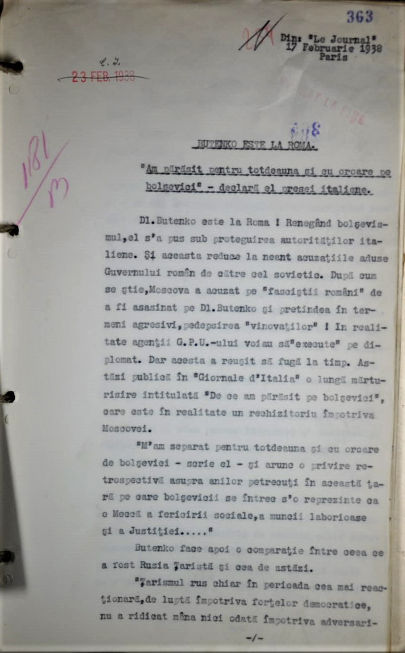 O situație deosebită, tratată cu maximă atenție de instituțiile de securitate ale statului român, în contextul relațiilor de regulă încordate cu marele vecin de la Răsărit, a fost dispariția, la data de 6 februarie 1938, a consilierului Legației URSS la București, Theodor Hrisanfovici Butenko, la acel moment reprezentantul de cel mai înalt nivel al statului sovietic în România, numit însărcinat cu afaceri la 1 decembrie 1937.